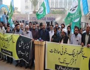 جماعت اسلامی کا ٹریفک حادثات کے خلاف نمائش چورنگی پر دھرنا