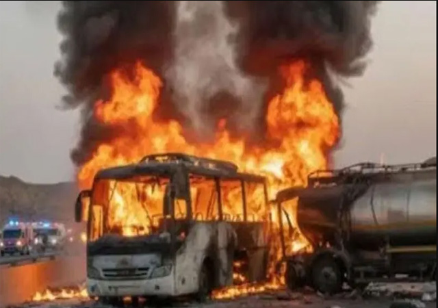واقعہ رات تقریبا 1 بج کر 30 منٹ پر پیش آیا جب مفریحات کے نزدیک بس ایک ڈیزل ٹینکر سے جا ٹکرائی۔ بس میں سوار اکثر مسافر اس وقت سو رہے تھے، جس کی وجہ سے آگ لگنے کے بعد بچنے کے مواقع نہ ہونے کے برابر تھے۔
