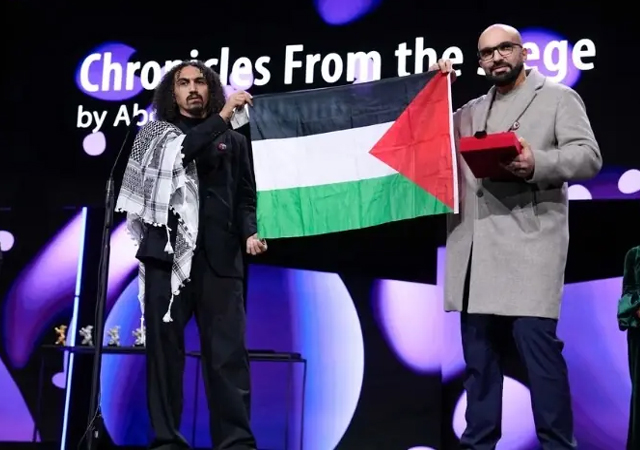 برلینالے کے ’پروسپیکٹو‘ سیکشن کا ایوارڈ جیتنے والی فلم ’کرونیکلز فرام دی سیج‘ کے فلم ساز عبداللّٰہ الخطیب نے اسٹیج پر فلسطینی پرچم بلند کرتے ہوئے کہا، ’جرمن حکومت اسرائیل کے ساتھ مل کر غزہ میں نسل کشی کی شریک ہے۔‘