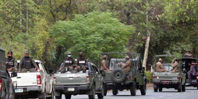 راولپنڈی کینٹ میں جی ایچ کیو کے قریب پاک فوج کے دستے گشت کر رہے ہیں۔