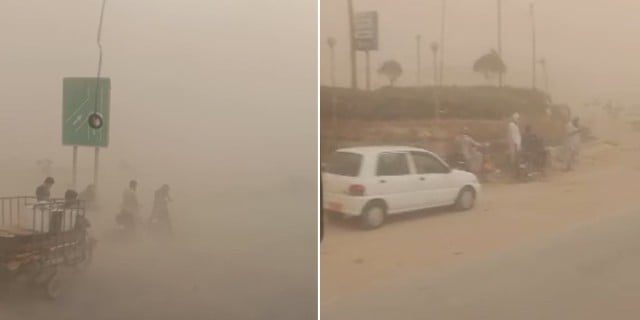 خبر میں دی گئی ایک ویڈیو سہراب گوٹھ کی ہے جہاں تیز ہوا اور گرد کے طوفان کی وجہ سے لوگوں نے گاڑیاں اور بائیکس سڑک کنارے کھڑی کردیں۔