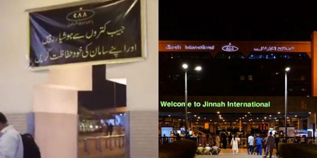 کراچی ایئرپورٹ پر مسافروں کو خبردار کرتے ہوئے ’جیب کتروں سے ہوشیار رہیں، مسافر اپنے سامان کی خود حفاظت کریں،‘ کے اعلان پر مبنی لگے بینرز شدید عوامی ردعمل کے بعد سول ایوی ایشن اتھارٹی نے اتار لیے۔